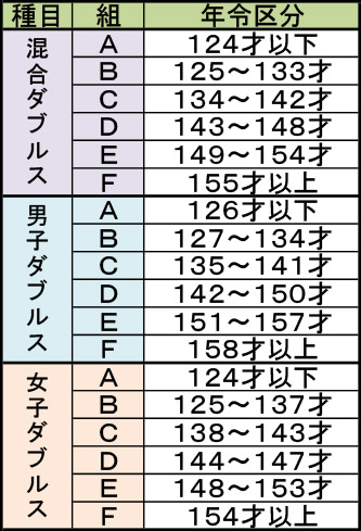 「第64回東海卓球ベテラン会ラージボール安城大会」年齢区分決定についておよび、メンバー変更について 1.年齢区分決定について(年齢は令和8年4月1日現在、2名の合計) ![]() 2.メンバー変更について メンバー変更は大会当日開会式開始前までに受付へ変更届を提出して下さい。 (詳細→大会情報R7年度) |